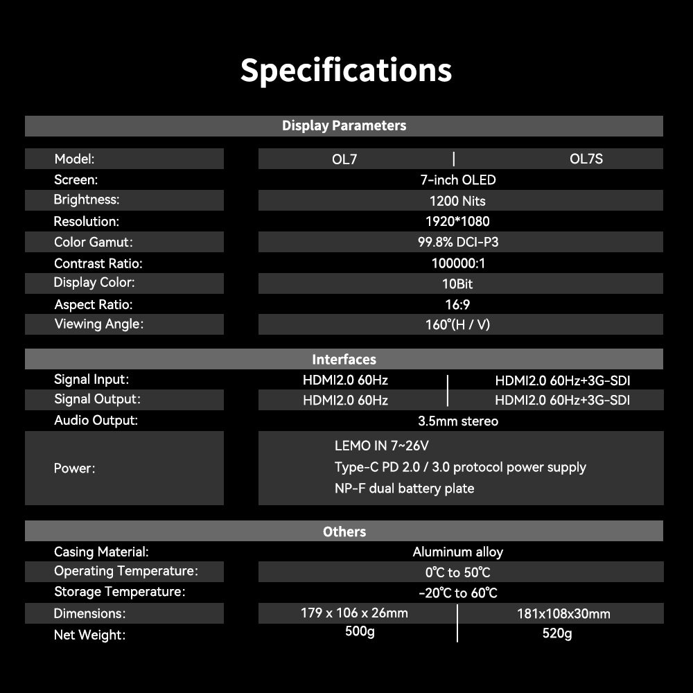 Desview OL7S je 7palcový monitor OLED na s jasem 1200 nitů, kontrastním poměrem 100 000:1 a 10bitovou barevnou hloubkou (1,07 miliardy barev). Díky vstupům/výstupům 4K60p HDMI a 3G-SDI zajišťuje bezproblémovou integraci do profesionálních vysílacích a filmových pracovních postupů.
