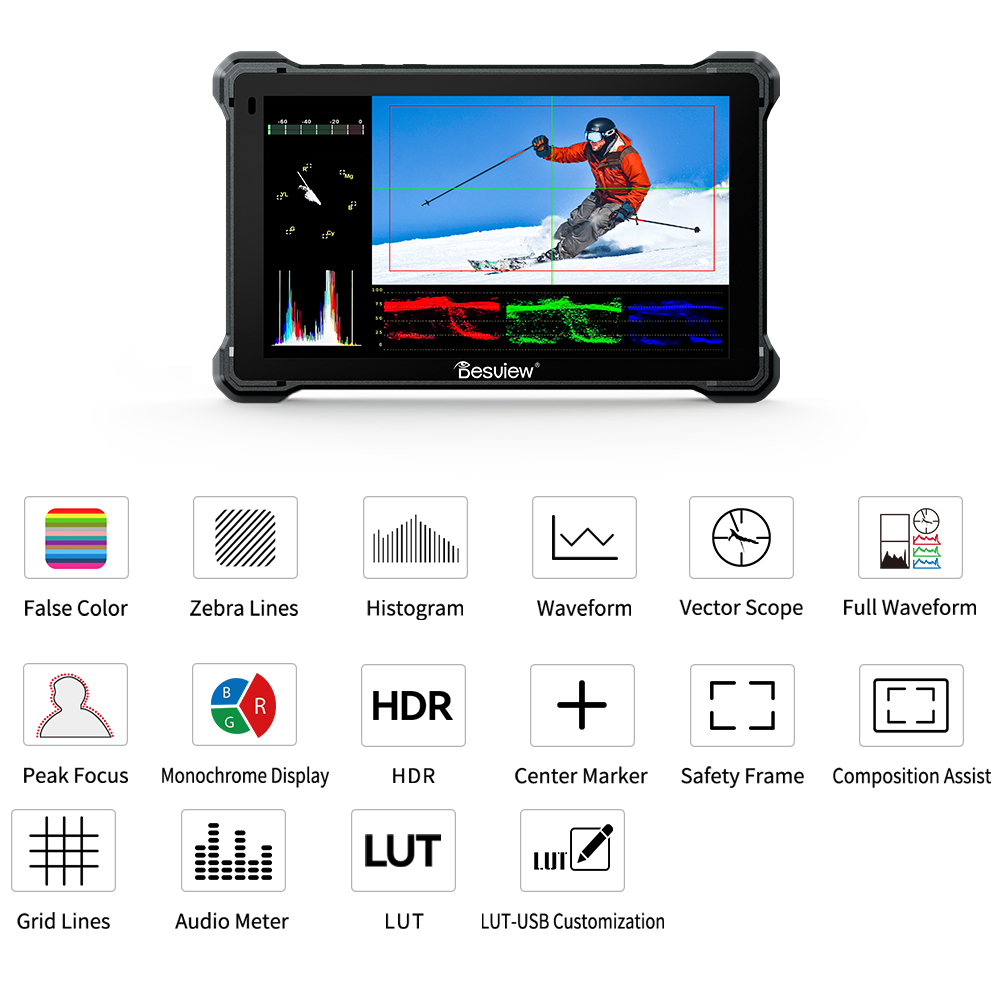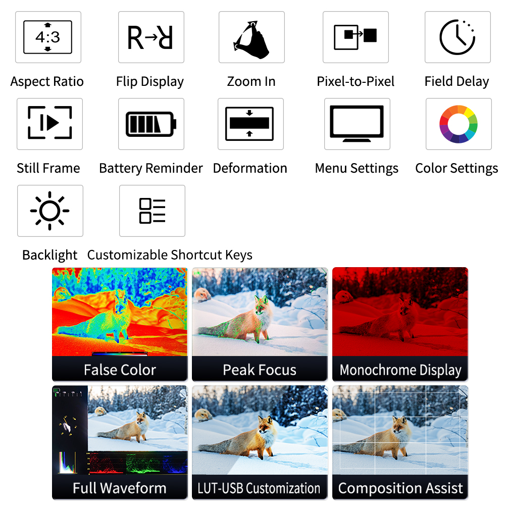 Celá řada pomocných funkcí Dodává se s celou řadou pomocných funkcí pro snímání, jako je plný průběh, teplota barev, špičkové zaostření, falešná barva, deformační funkce, čáry zebry a statický snímek atd. |