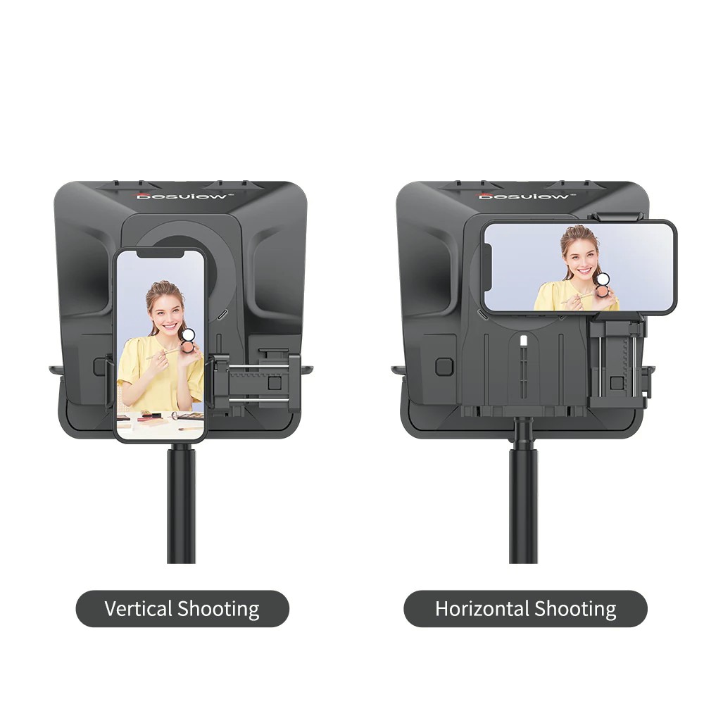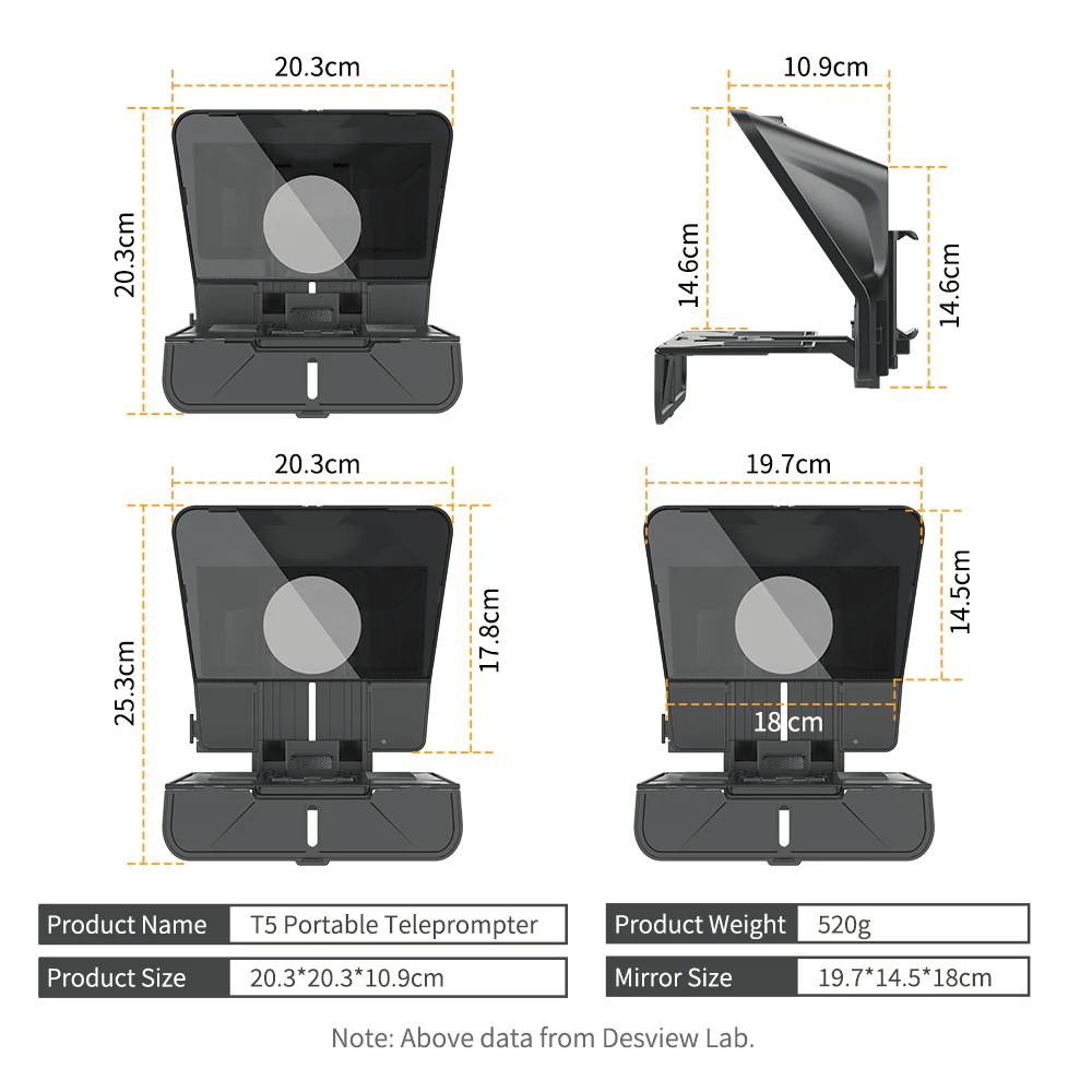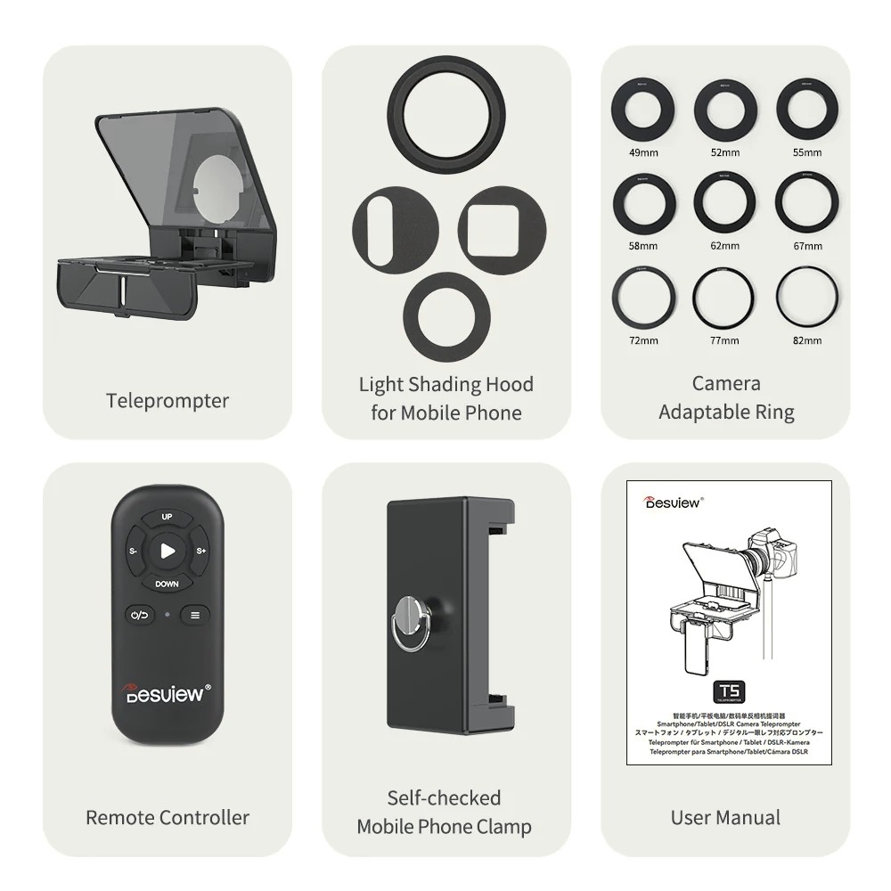 Desview T5 je inovativní přenosný teleprompter s dvojitým displejem, který byl navržen pro přirozený oční kontakt a sebevědomé vystupování během živého vysílání, vlogování, online kurzů a rozhovorů. Díky sklu rozdělovače paprsku v televizní kvalitě, dálkovému ovládání přes Bluetooth a široké kompatibilitě se zařízeními umožňuje snadné a plynulé profesionální prezentace.