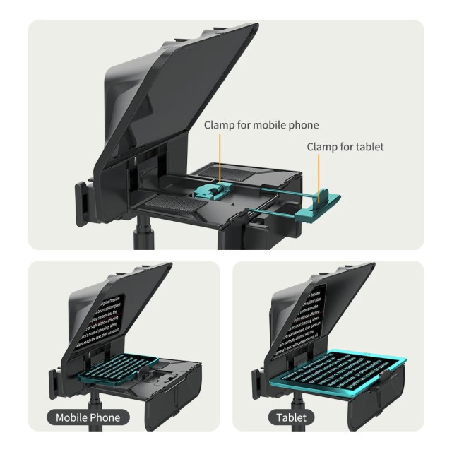 Přenosný teleprompter Desview T5 kombinuje profesionální vysílací odbornost s inovativním designem pro spolupráci na dvou obrazovkách, který zlepšuje živé vysílání a tvorbu obsahu. Jeho primární displej promítá obsah scénáře ve vysokém rozlišení, zatímco sekundární nastavení pro vlastní monitorování umožňuje tvůrcům sledovat živé komentáře nebo stav natáčení v reálném čase, což zajišťuje plynulé doručení a autentické zapojení publika. Profesionální sklo rozdělovače paprsku nabízí jasný, čitelný text s 70% propustností světla a 30% odrazivostí, což zajišťuje, že nedochází k žádnému ovlivnění kvality obrazu. T5 podporuje vertikální i horizontální natáčení a je kompatibilní se smartphony, tablety do 11 palců a fotoaparáty používajícími adaptabilní kroužky 49–82 mm. Jednoduchá instalace pomocí zacvaknutí umožňuje rychlé a intuitivní nastavení, zatímco roztažitelná svorka podporuje rozsah upnutí až 19 cm. Dálkové ovládání Bluetooth a aplikace Desview Teleprompter App umožňují bezdrátové ovládání posouvání, rychlosti a velikosti písma. Díky dvojitým držákům horké patky, univerzálnímu šroubu 1/4" a stínící cloně je Desview T5 univerzálním řešením pro telepromptery pro online kurzy, živé prodeje, rozhovory a produkci VLOGů.