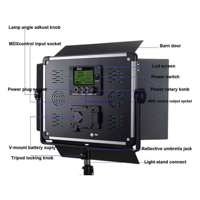Digitálny displej, DMX 512, manuálne ovládanie. Materiál: hliník. Svetelný zdroj LED , uhol svetla 60 stupňov, CRI 97RA. Podpora batérií: SONY NP-F550, F750, F970 batéria. STRIEDAVÝ PRÚD 100-250 V A JEDNOSMERNÝ PRÚD 14,5 V