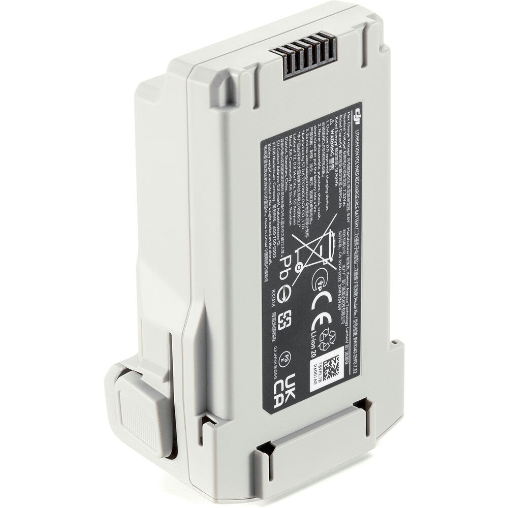 Nabíjení lze provádět pomocí volitelné 30W USB-C nabíječky. Při použití obousměrného nabíjecího hubu trvá plné nabití přibližně 58 minut, nebo až 70 minut při nabíjení baterie uvnitř dronu. Tato inteligentní baterie je lehká a kompaktní (77,9 g) a je ideální jako náhradní, náhradní nebo přídavná baterie pro delší mise dronu. Podporuje také inteligentní systém správy baterií DJI, který sleduje stav baterie a zajišťuje bezpečný provoz.