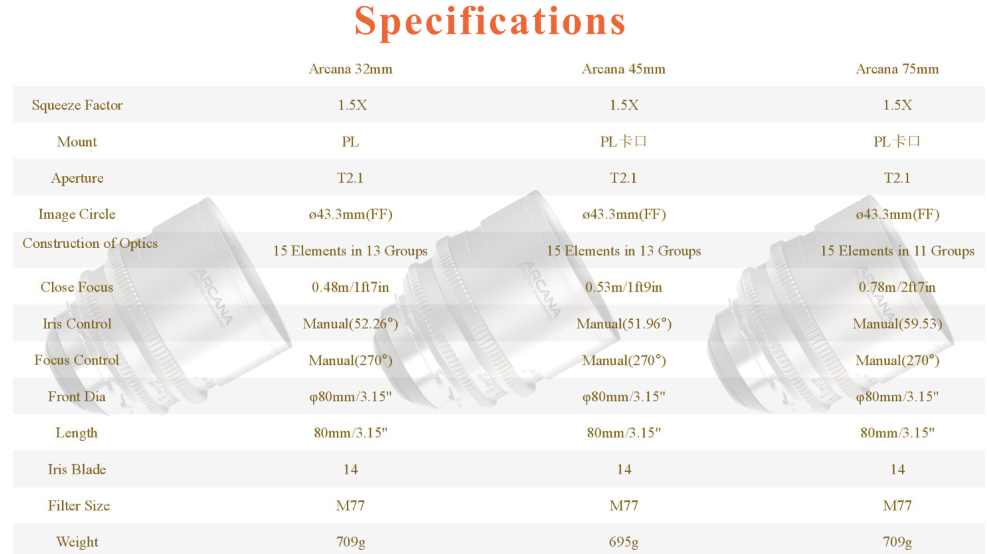 Sada tří objektivů DZOFILM Arcana 32/45/75 mm T2.1 Full-frame 1,5× Hybrid Anamorphic Prime (bajonet PL) je profesionální sada anamorfních objektivů určená pro full-frame filmovou produkci. Díky kompresnímu faktoru 1,5×, cloně T2.1 a jednotnému kompaktnímu designu u všech ohniskových vzdáleností nabízí filmařům kinematografické oválné bokeh, charakteristické anamorfní odlesky a vysoký optický výkon.