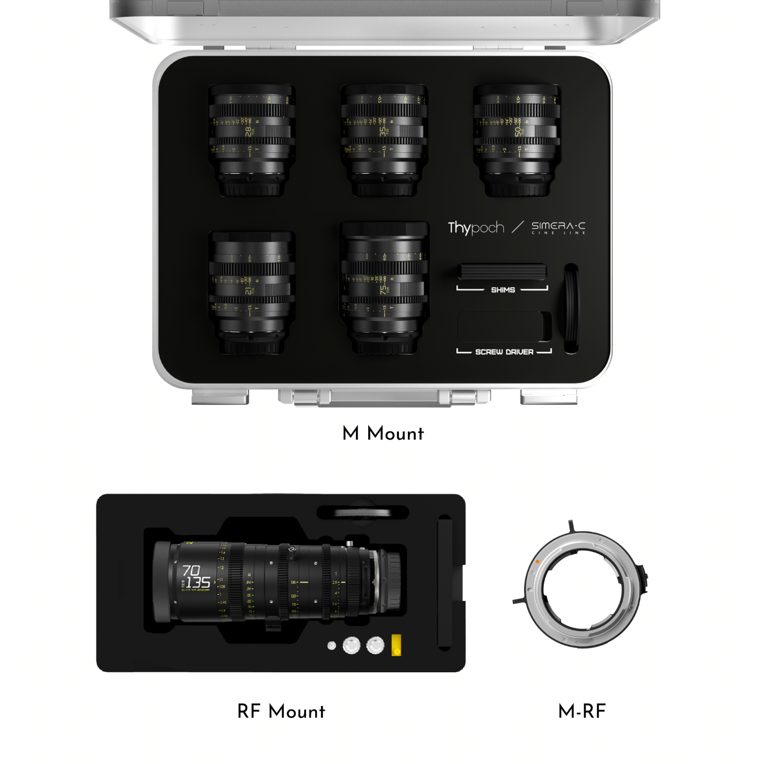 Sada prémiových objektivů Thypoch Simera-C s pevnou ohniskovou vzdáleností + zoom objektiv DZOFILM Catta Zoom 70-135mm. Celkový rozsah ohniskových vzdáleností 21–135 mm pokrývá různé tvůrčí potřeby.