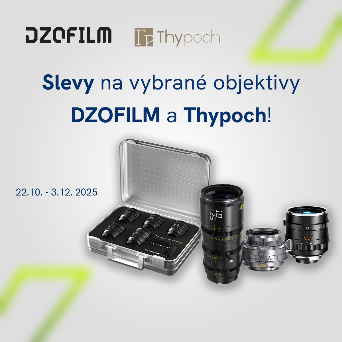 Od 22. října do 3. prosince 2025 probíhají speciální slevové akce na vybrané produkty DZOFILM a Thypoch, které přinášejí skvělé příležitosti k rozšíření vaší fotografické i filmové výbavy. V akci najdete postupně slevy na tyto produktové řady: