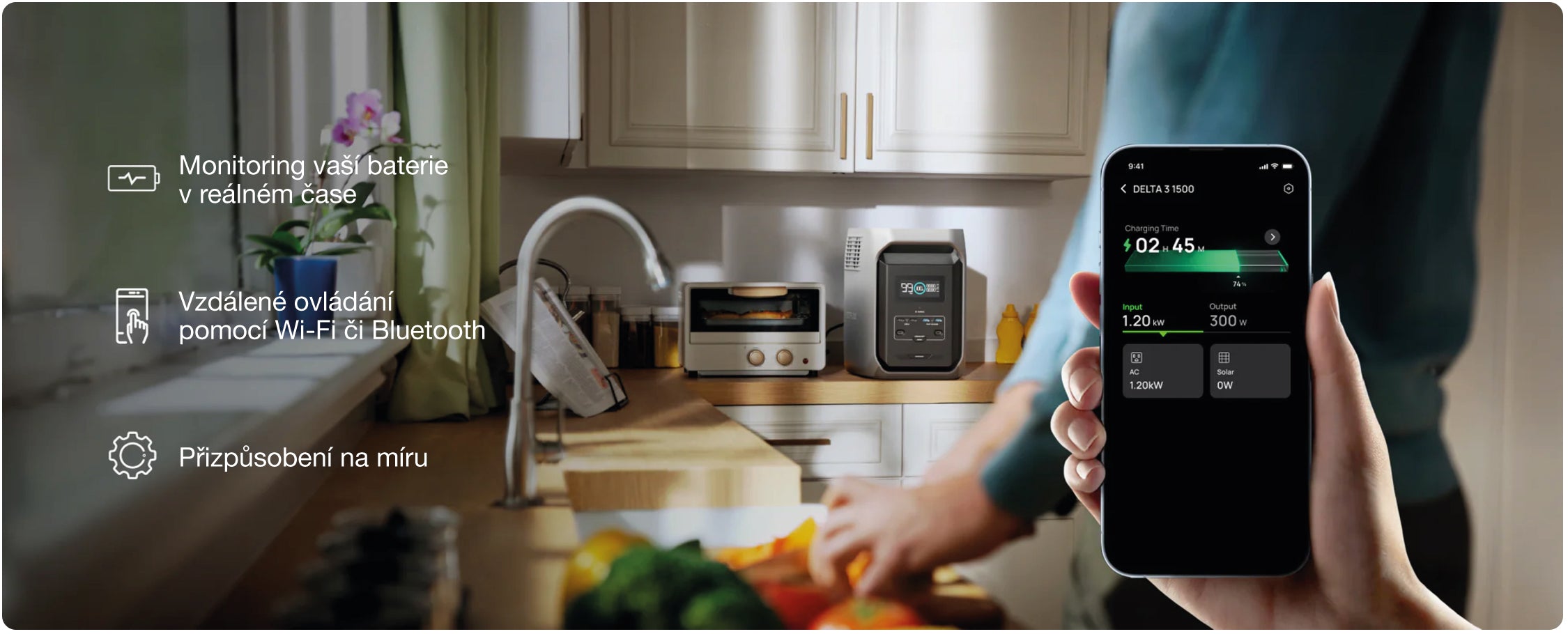EcoFlow DELTA 3 dokáže napájet 99 % domácích spotřebičů, včetně ledničky, televize a počítače. Díky technologii X-Boost můžete nepřetržitě provozovat výkonné spotřebiče až do 2400 W, od trouby po fén.
