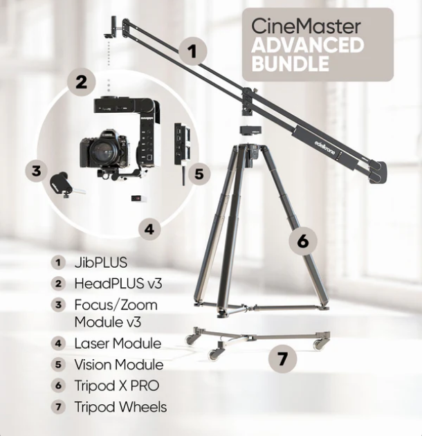 Sada Edelkrone CineMaster Bundle - Advanced nabízí kompletní systém řízení pohybu, včetně JibPLUS, HeadPLUS v3, modulu ostření/zoomu, modulu vidění, laserového modulu, stativu X PRO a stativových koleček. Poskytuje přesné, filmové pohyby kamery pro profesionály, kteří chtějí snadno a flexibilně vytvářet úchvatné záběry.
