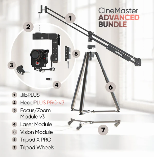 Modul JibPLUS poskytuje rozsáhlé vertikální a horizontální záběry s výložníkem, zatímco HeadPLUS PRO v3 nabízí plynulé nastavení otáčení a naklápění. Dodávaný modul Focus/Zoom Module v3 umožňuje přesné zaostření a ovládání zoomu a laserový modul pomáhá zajistit zarovnání pro dokonalé záběry. Modul Vision poskytuje zpětnou vazbu od fotoaparátu v reálném čase, čímž vylepšuje proces fotografování. Díky těmto funkcím můžete snadno dosáhnout vysoce vybroušených filmových záběrů.