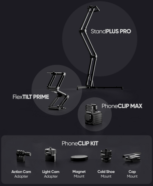 Vše, co potřebujete k upevnění, umístění a fotografování s jakýmkoli fotoaparátem nebo telefonem - okamžitě. Sada Creator Essentials Bundle obsahuje stojan StandPLUS PRO, FlexTILT PRIME, PhoneCLIP MAX a kompletní sadu PhoneCLIP KIT.