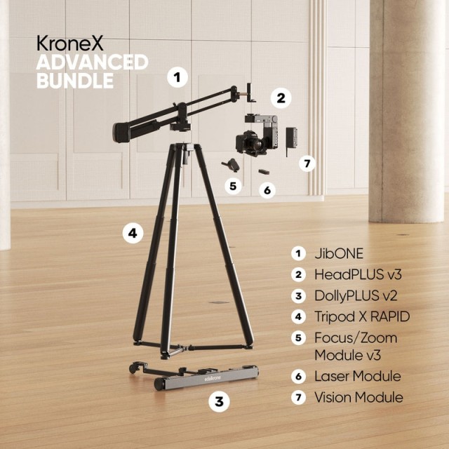 Edelkrone KroneX Bundle - Advanced: Obsahuje HeadPLUS v3, JibONE v3, DollyPLUS v2, Tripod X RAPID, Focus/Zoom Module v3, Laser Module a Vision Module pro přesné pohyby kamery a dynamické natáčení.