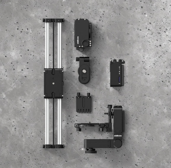 Kompletní sada Edelkrone SlideMaster Bundle obsahující SliderPLUS PRO Long, motorový modul, vertikální modul a HeadPLUS v3 pro přesné a všestranné řízení pohybu.