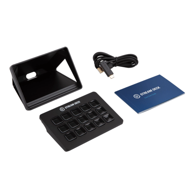 Stream Deck, stolní stojan, kabel USB-C na USB-A, stručný návod k použití