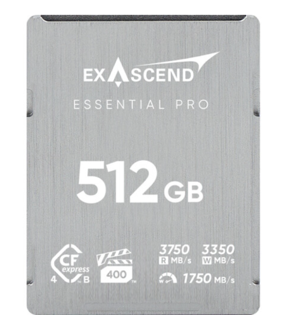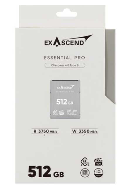 Karta Exascend EXPC4EB512GB Essential Pro CFexpress 4.0 Type B 512 GB nabízí rychlost čtení 3750 MB/s a rychlost zápisu 3350 MB/s pro video 8K/12K 120 fps. Certifikace VPG-400 s adaptivní tepelnou regulací, životnost 300 TB TBW a doživotní záruka s obnovou dat.