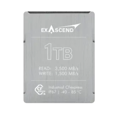 Exascend Industrial CFexpress CFB400 PCIe Gen4 1 TB (EXPC4SB001TB-I) je odolná karta CFexpress typu B se 176vrstvým 3D TLC NAND, která nabízí rychlost čtení až 3 500 MB/s a rychlost zápisu až 3 000 MB/s pro videa a bursts s vysokou šířkou pásma 8K/4K. Pracuje v teplotním rozsahu od -40 °C do +85 °C s adaptivní tepelnou regulací, šifrováním SED (TCG Opal 2.0) a 370k/170k IOPS, což je ideální pro průmyslové kamery, sledovací systémy a vestavěné systémy.