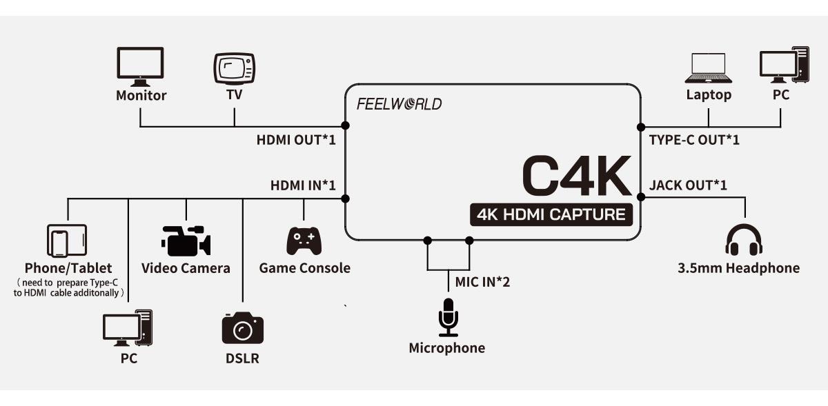 FEEWORLD C4K Video Capture 4K HDMI 60Hz vstup a výstup USB-C Plug and Play pro streamování her a videokonferencí. Kapesní velikost, malý a přenosný. USB3.0 plug and play, bez nutnosti instalace ovladačů. Kompatibilní s OBS Studio, Potplayer a dalšími programy.