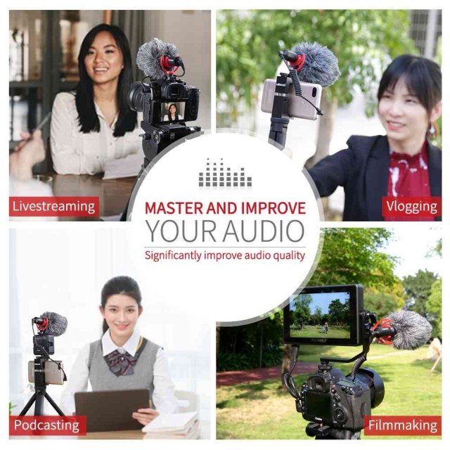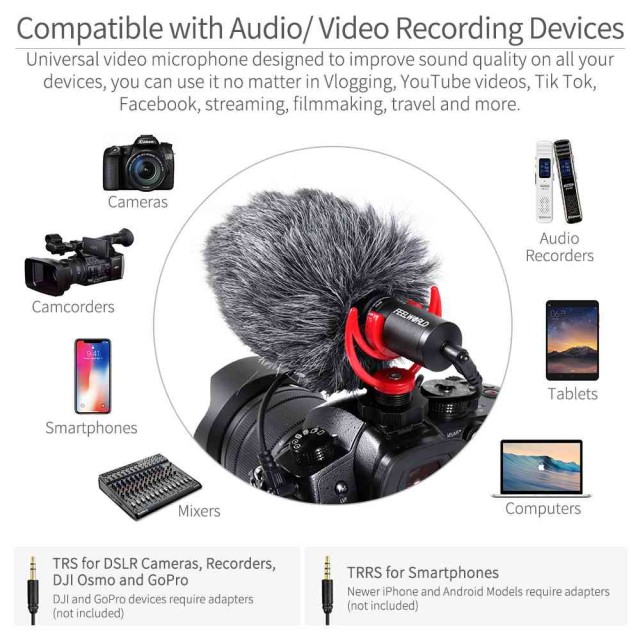 Univerzální kompatibilita – Kompatibilní se zařízeními pro záznam zvuku/videa. TRS pro digitální zrcadlovky, rekordéry, DJI Osmo a GoPro (zařízení DJI a GoPro vyžadují adaptéry (nejsou součástí balení)). TRRS pro smartphony (novější modely iPhone a Android vyžadují adaptéry (nejsou součástí balení)).