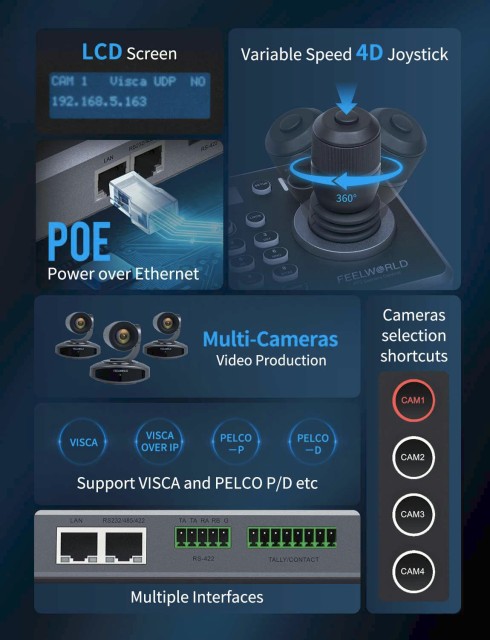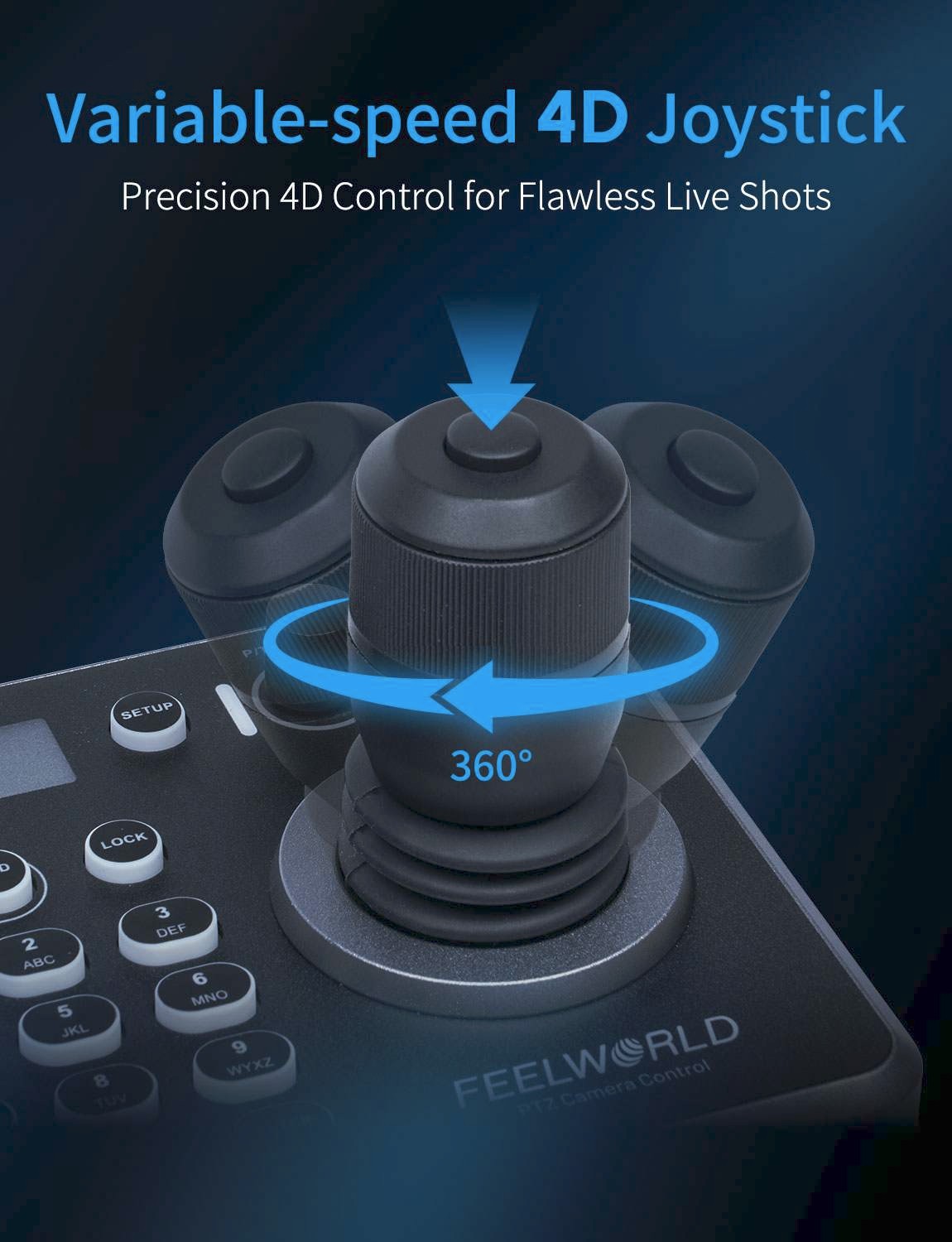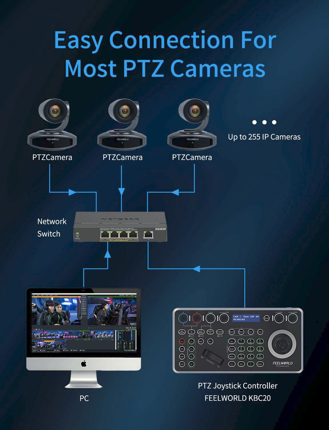 Feelworld KBC20 je profesionální ovladač PTZ kamer určený pro produkce s více kamerami, který nabízí přesné ovládání pomocí 4D joysticku, podporu více protokolů, napájení PoE a možnost spravovat až 255 PTZ kamer pro živé události, konference, vysílání a vzdělávání.
