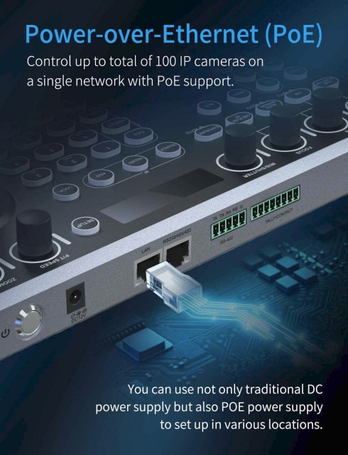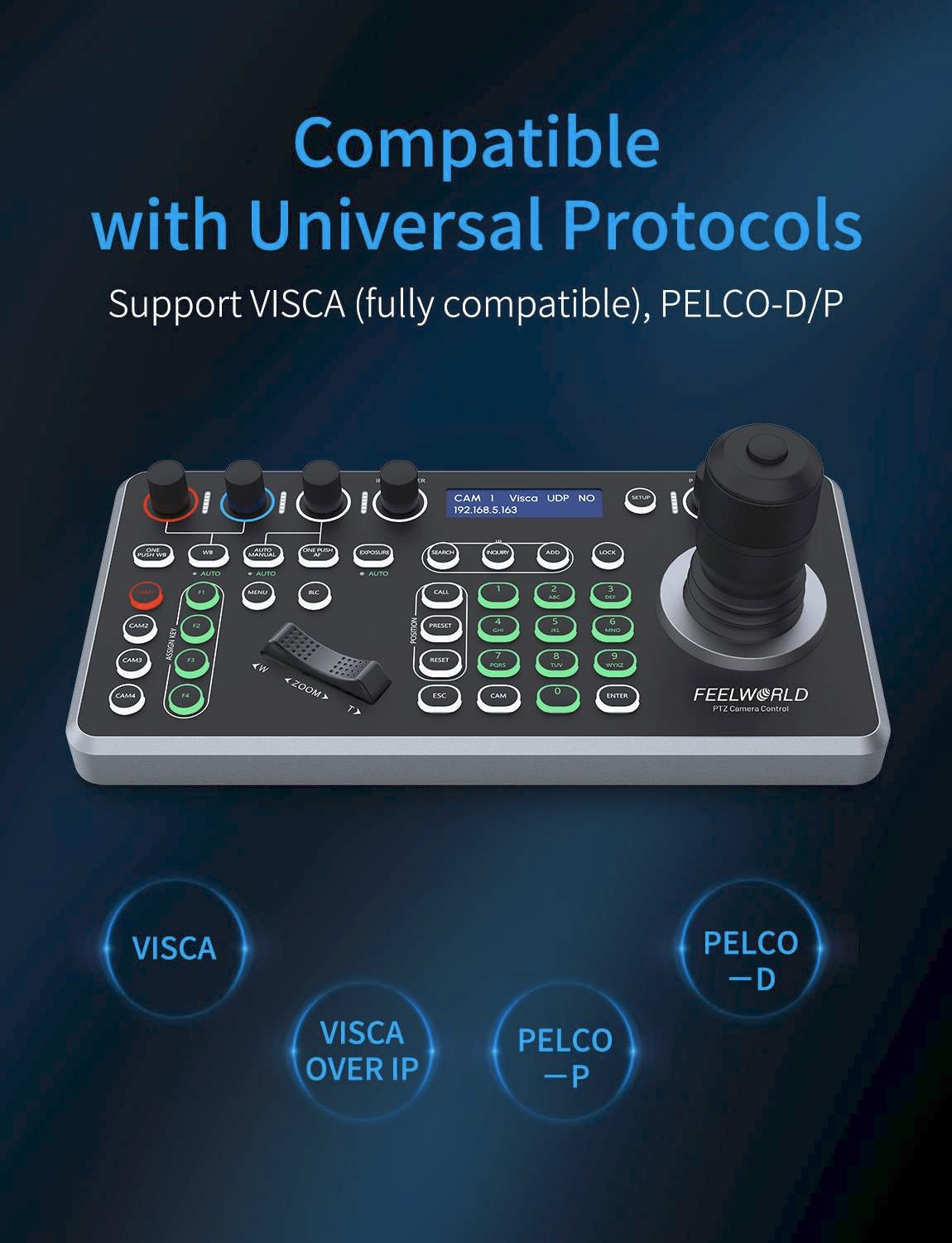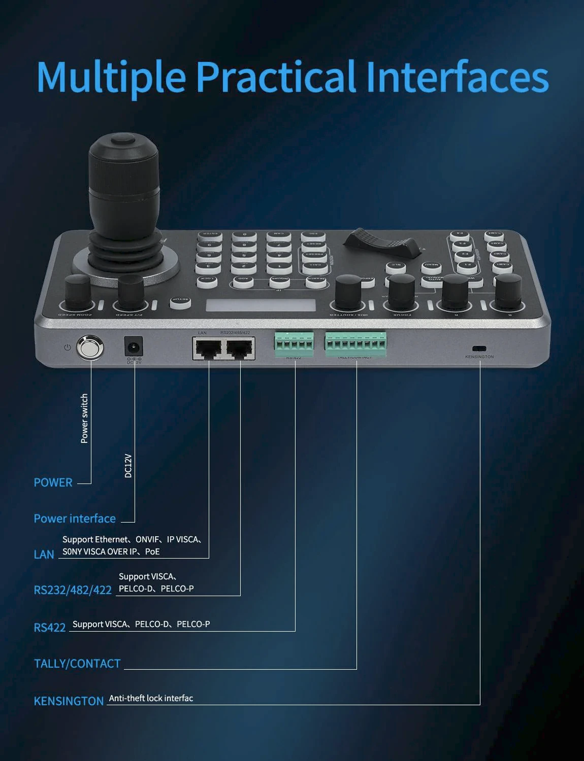 KBC20 podporuje širokou škálu ovládacích protokolů, včetně ONVIF, IP VISCA, Sony VISCA, Pelco-D a Pelco-P, a lze jej snadno integrovat s většinou PTZ kamer na trhu. Může ovládat až 255 PTZ kamer přes IP nebo sériové připojení, s rychlým výběrem kamery pomocí numerických kláves a čtyřmi vyhrazenými tlačítky CAM1–CAM4 pro okamžité přepínání mezi často používanými kamerami.