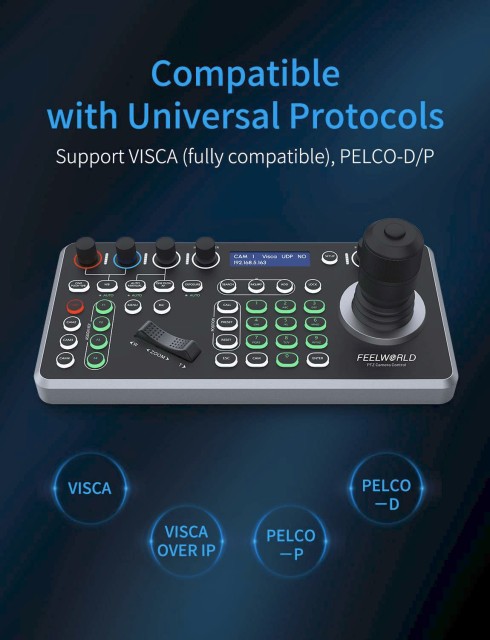 Ovladač kamery Feelworld KBC20 PTZ je výkonné a flexibilní řešení pro ovládání, které je určeno pro náročné prostředí s více kamerami, jako jsou studia pro živé vysílání, kostely, konferenční sály, přednáškové sály, školicí místnosti a televizní produkce. Díky ergonomickému ovládacímu panelu a vysoce citlivému 4D joysticku poskytuje KBC20 plynulé a přesné ovládání otáčení, naklánění, zoomu, zaostření, clony a rychlosti kamery, což zaručuje vždy profesionální pohyb kamery.