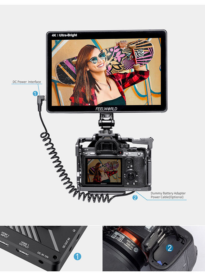 LUT11H je vybaven nejen vstupem DC IN 12V (vhodný pro použití 12/3A adaptéru), ale poskytuje také pomocný výstup napájení (DC OUT 8V), který umožňuje fotografům napájet jejich fotoaparáty. S kabelem adaptéru baterie (volitelný) prodlužuje LUT11H dobu provozu fotoaparátu a zároveň poskytuje použitelnější displej.