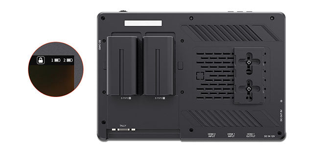 Zadní strana monitoru LUT11H má duální desky pro baterie, lze do ní nainstalovat dvě standardní baterie NP-F, dlouhotrvající napájení pro vaši obrazovku. Kromě toho můžete baterii rychle přepínat, stačí dvakrát klepnout na ikonu baterie v pravém horním rohu monitoru asi za 3 sekundy, abyste dokončili přepínání, a nemusíte se obávat přerušení sledování. Instalace jedné baterie F970 (6600 mAh) vydrží přibližně 2 hodiny a instalace dvou baterií F970 vydrží přibližně 3,5-4 hodiny. Podle potřeby si můžete zvolit instalaci 1 nebo 2 baterií.