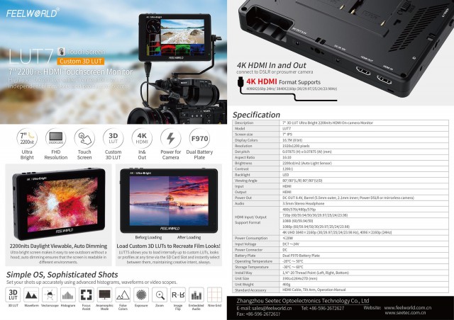 7“ kamerový monitor s vysokým jasem (2.200 cd/m², vč. senzoru okolního osvětlení pro automatické nastavení jasu), dotykovým displejem a podporou 3D LUT korekcí (integrovaný preset „Log to Rec.709“ nebo import vlastních .cube souborů). Dodává se vč. Mini/ Micro HDMI-HDMI kabelu a montážního ramínka. Varianta LUT7 s 4K HDMI I/O.