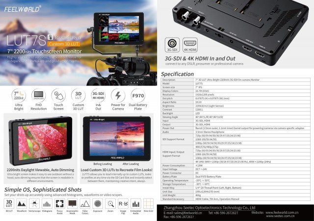 7“ kamerový monitor s vysokým jasem (2.200 cd/m², vč. senzoru okolního osvětlení pro automatické nastavení jasu), dotykovým displejem a podporou 3D LUT korekcí (integrovaný preset „Log to Rec.709“ nebo import vlastních .cube souborů). Dodává se vč. Mini/ Micro HDMI-HDMI kabelu a montážního ramínka. Varianta LUT7S s 4K HDMI a 3G-SDI I/O.