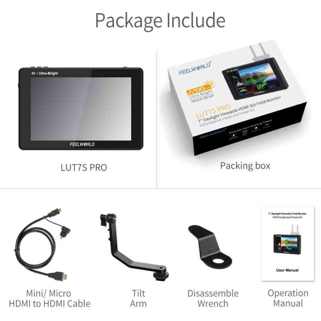 7“ kamerový monitor s vysokým jasem (2200 cd/m², vč. senzoru okolního osvětlení pro automatické nastavení jasu), dotykovým displejem a podporou 3D LUT korekcí (integrovaný preset „Log to Rec.709“ nebo import vlastních .cube souborů). Dodává se vč. Mini/ Micro HDMI-HDMI kabelu a montážního ramínka. Varianta LUT7S Pro s 4K HDMI a 3G-SDI I/O a možností instalace/napájení dalšího příslušenství (např. bezdrátové vysílače/přijímače) se slotem pro baterii L-Series.