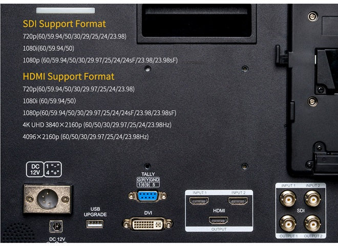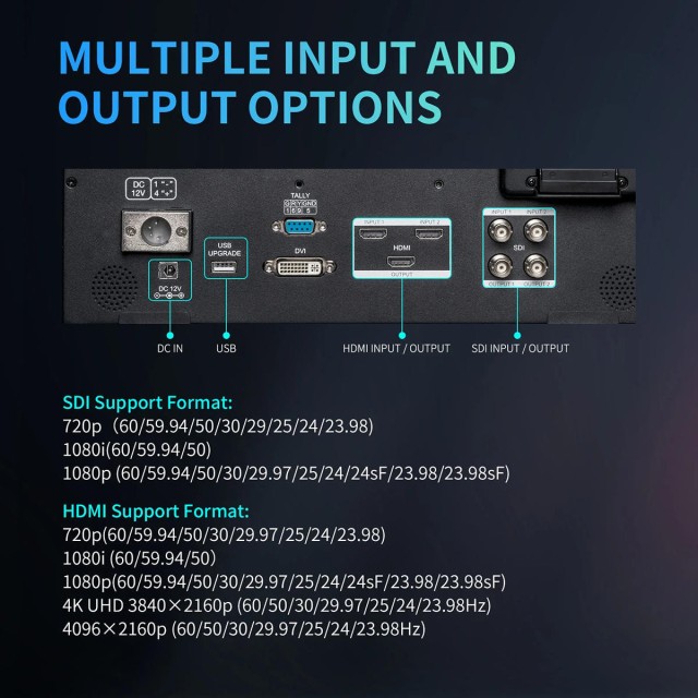 Monitor je vybaven porty 3G-SDI, HDMI2.0 a DVI, a je tak kompatibilní s profesionálními videokamerami a nejnovějšími digitálními bezzrcadlovkami.