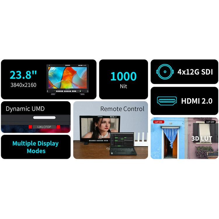Profesionální monitorovací nástroje zahrnují režimy multiview, časový kód, anamorfní de-squeeze, režim pixel-to-pixel, waveform, vectorscope, false color, focus peaking, značky na obrazovce, poměry stran a měření zvuku. S24 také nabízí kompatibilitu s bateriemi V-mount, 4pinový XLR napájecí vstup a integrované stereofonní reproduktory s monitorováním sluchátek, což jej činí univerzálním pro použití v terénu i ve studiu. Jeho hliníkové pouzdro a přiložený stolní stojan nebo držák VESA poskytují odolné a flexibilní možnosti instalace.
