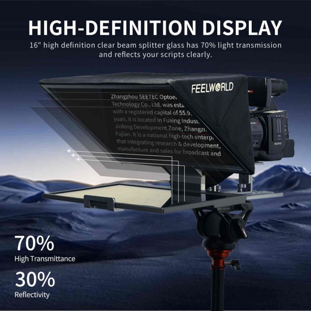 Feelworld/ANDYCINE T16 je 16palcový přenosný skládací čtecí zařízení, teleprompter s hliníkovým tělem s odnímatelným krytem kompatibilní s digitální zrcadlovkou, chytrými telefony s dálkovým ovladačem a ovládáním pomocí aplikace pro iOS nebo Android.