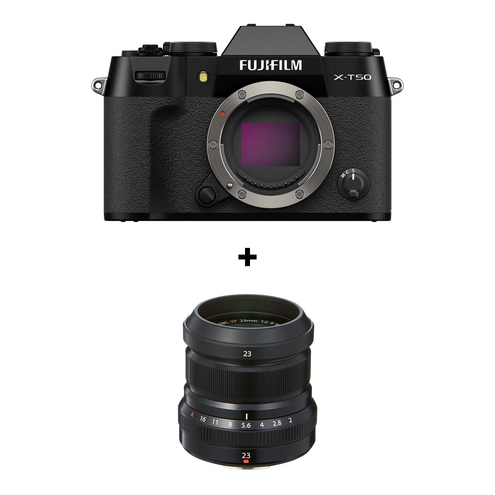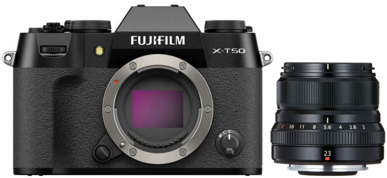 Fujifilm X-T50 Black je lehký bezzrcadlový fotoaparát APS-C inspirovaný dálkoměrem (123,8 × 84 × 48,8 mm, 438 g s baterií/SD kartou) vybavený snímačem X-Trans CMOS 5 HR s rozměry 23,5 × 15,6 mm a rozlišením 40,2 MP a procesorem X-Processor 5, který umožňuje pořizovat 14bitové snímky ve formátu RAW s rozlišením 7728 × 5152, nativním ISO 125–12 800 (ext. 64–51 200) a ultrarychlé elektronické rychlosti závěrky až 1/180 000 s pro přesné ovládání expozice. Video funkce zahrnují 6,2K/30p open-gate 3:2 (200 Mb/s, 10bitový H.265), 4K/60p a FHD/240p zpomalené záběry s plným čtením snímače, podporované digitálním IS + IS Boost pro stabilitu při ručním držení. Hybridní fázový/kontrastní systém AF s 425 body funguje do -7 EV s hlubokým učením AI rozpoznávání objektů (lidé, zvířata, ptáci, vozidla, letadla, hmyz, drony) a sledováním. Speciální otočný volič simulace filmu na horní desce poskytuje okamžitý přístup k 20 režimům, včetně REALA ACE a Nostalgic Neg., se třemi vlastními sloty; režim AUTO automaticky vybírá nastavení pomocí rozpoznávání objektů. 5osý IBIS nabízí kompenzaci až 7 stupňů (CIPA, náklon/odchylka s XF35mm f/1,4), zatímco 0,39" 2,36M-dot OLED EVF (0,62× zvětšení, 100 fps) a 3" 1,84M-dot vari-angle dotykový displej (dotykové AF/ovládání) usnadňují kreativní úhly. Konektivita zahrnuje USB-C 10 Gbps (nabíjení/data), micro-HDMI (12bitový RAW výstup), Wi-Fi 4, Bluetooth 5.2 a 2,5mm jack pro mikrofon/dálkové ovládání; úložiště je zajištěno dvěma sloty UHS-II SD. Vestavěný blesk (GN 5) a TTL horká patka podporují externí osvětlení. Baterie NP-W126S poskytuje ~305 snímků (CIPA LCD). V kombinaci s objektivem XF 23 mm f/2,0 R WR tvoří univerzální sadu pro pouliční fotografii s odolnou, rychlou optikou.