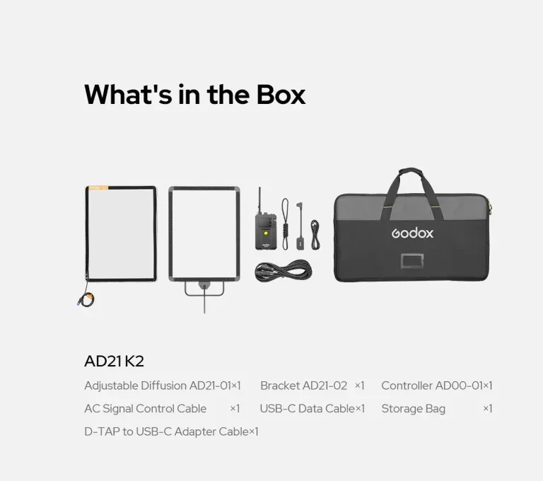 Nastavitelné difuzní panely Godox AD21 K2 přinášejí novou dimenzi osvětlení na place díky motorizovanému, plně nastavitelnému difuznímu efektu. Panely AD21 jsou určeny pro fotografy a kameramany, kteří vyžadují přesné ovládání. Disponují režimem Level Mode pro nastavení difuzního efektu v rozmezí 0–100 % a režimem Light Reduction Mode pro jemné ovládání EV (-0,1 až -2,0 EV), což umožňuje snadný přechod od tvrdého světla k ultrajemnému osvětlení. Panely pracují bez blikání až do 300 fps, jsou napájeny z USB-C, V-mount nebo NP-F baterií a poskytují až 20 hodin nepřetržitého provozu z jedné 100Wh baterie.