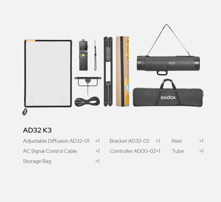 Sada nastavitelného difuzoru Godox AD32 K3 obsahuje skládací rám s motorizovaným ovládáním difúze, který umožňuje přesné a bezblikové nastavení pro filmové a studiové osvětlení. Je přenosná, univerzální a kompatibilní s více zdroji napájení, takže je ideální pro profesionální použití na místě i ve studiu.