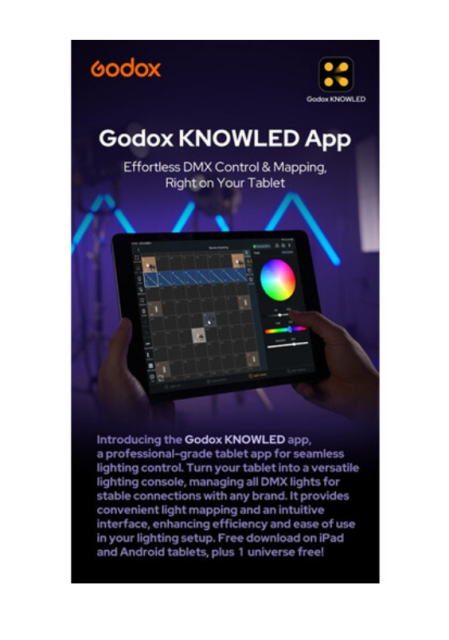 Světlo podporuje stmívání 0–100 % v krocích po 0,1 %, 11 speciálních efektů (včetně ohňostrojů, blesků, televize a svařování) a čtyři stmívací křivky pro filmové ovládání. Možnosti připojení zahrnují Bluetooth, 2,4 GHz bezdrátové připojení, LumenRadio CRMX, DMX a ovládání pomocí aplikace Godox Light pro Android a iOS. Díky ventilátorovému chlazení, odolnosti proti prachu a vodě IP54, naklápěcímu 360° držáku a odolnému upevnění je spolehlivé pro použití v interiéru i exteriéru. Systém G-Mount zajišťuje kompatibilitu s širokou škálou modifikátorů světla Godox.