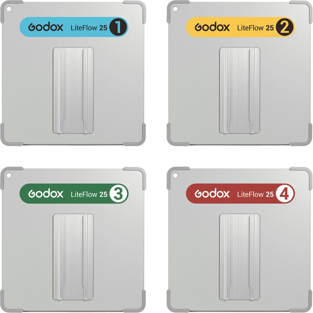 Sada reflektorů Godox Knowled LiteFlow 25 je profesionální řešení pro filmové osvětlení, které obsahuje čtyři hliníkové reflektory o rozměrech 10 × 10 palců s tvrdým, středním, měkkým a měkkým páskovým rozptylem. Nabízí přesné ovládání nepřímého osvětlení v kompaktní, přenosné sadě s měkkým přenosným pouzdrem.