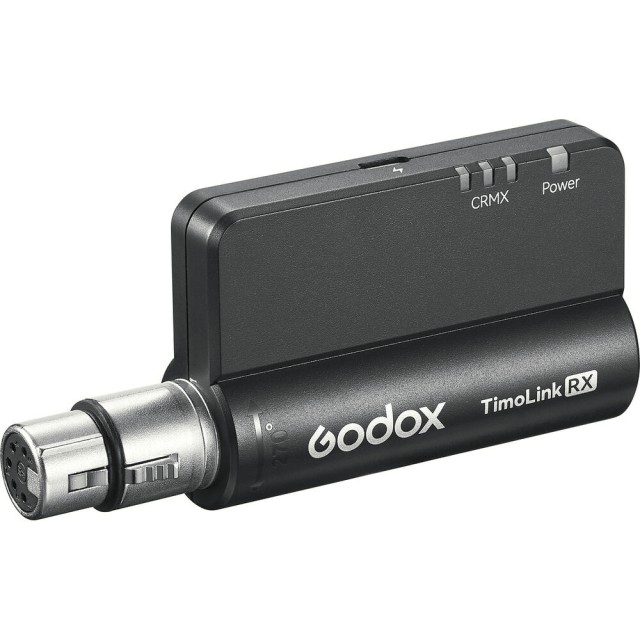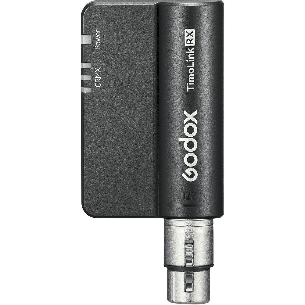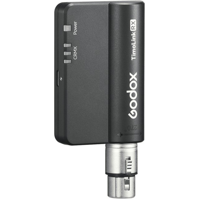 Bezdrátový DMX přijímač Godox TimoLink RX s vestavěným modulem LumenRadio CRMX umožňuje filmařům a televizním stanicím převést kabelové DMX sestavy na bezproblémové bezdrátové ovládání. S působivým dosahem 984 stop a otočným 5pinovým XLR konektorem o 270° zajišťuje spolehlivé a flexibilní připojení pro širokou škálu DMX zařízení.