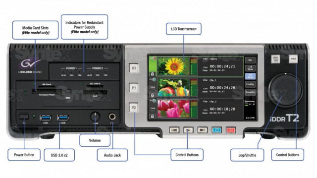 Nové rekordéry/přehrávače videa Grass Valley T2 4K jsou navrženy pro televizní studia nebo přenosové vozy zpracovávající velké množství audio i video formátů vč. SD, HD, UHD nebo 4K DCI standardů. Kombinují vzhled a filozofii práce klasických videorekordérů s moderním ovládáním pomocí dotykového displeje nebo aplikace. Slouží nejen k nabírání materiálu, ale i k přehrávání, správě nebo archivaci videomateriálu, či jako zdroj videa/grafiky pro režijní pracoviště. Dedikovaná aplikace usnadňuje výběr médií či tvorbu playlistů, samozřejmostí je také integrace s firemní aplikací EDIUS např. pro trimování a editaci klipů během záznamu (verze Elite).
