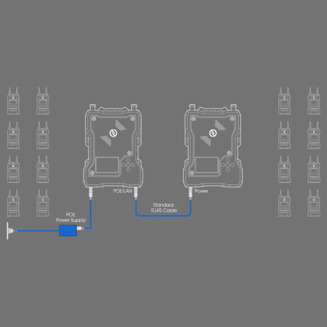 Krom integrované antény (dosah až 400 m v přední polosféře resp. 50 m v zadní) -- která se hodí zejména ke komunikaci ve volných prostranstvích a málo zastavěných interiérech (koncertní síně, kostely apod.) -- disponuje základní stanice také externími FRP anténami pro dosah cca 300 m v plném 360º rozsahu (ideální např. pro výstavní prostory, sportovní stadiony apod.).