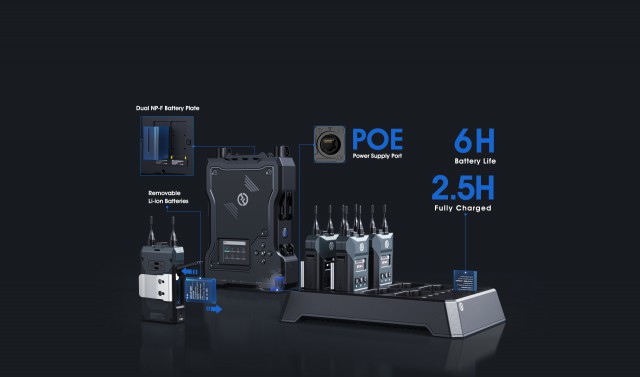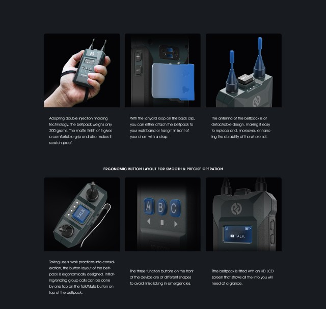 Součástí dodávky jsou profesionální headsety s konektory typu Lemo, k beltpackům lze ale připojit také jiná sluchátka s konzumními 3,5mm konektory. Zajímavostí je rovněž výměnná dvojice Li-ion akumulátorů beltpacků, které lze samostatně nabít za cca 2,5 h pro výdrž až 6 hodin na jeden akumulátor.