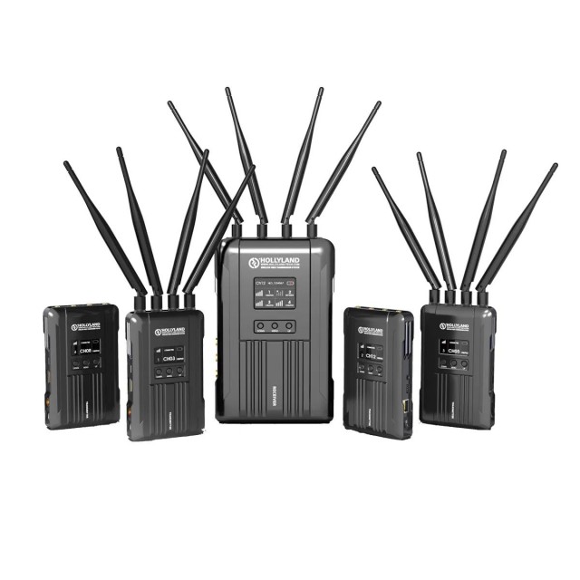 Systém (4x TX + 1x RX) pro bezdrátový přenos synchronního A/V materiálu v rámci multikamerových produkcí na vzdálenost až 550 m v pásmu 5 GHz. Nabízí SDI i HDMI I/O s podporou až 1080p videa, ovládání PTZ kamer po rozhraní RS485 / RS422 / LAN, možnost použít externí signalizační světla a provoz 4 TX na stejném kanálu s latencí 70 ms. Balení obsahuje 4x vysílače, 1x přijímač, 25x 5GHz antény, 7“ montážní ramínko, napájecí adaptér a nezbytnou kabeláž.