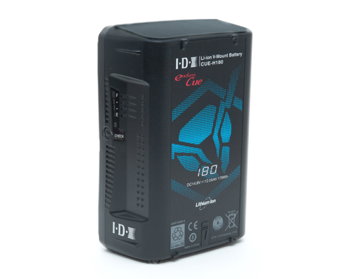 The CUE-H180 V-Mount battery answers to the power demands of digital cinematography and broadcast cameras where high current loads of 12A/155W are standard. The CUE-H180 provides a robust 179Wh capacity with the ability to comfortably handle 12A/155W loads, as well as a single built-in D-Tap output capable of taking a 80W load for powering accessories.