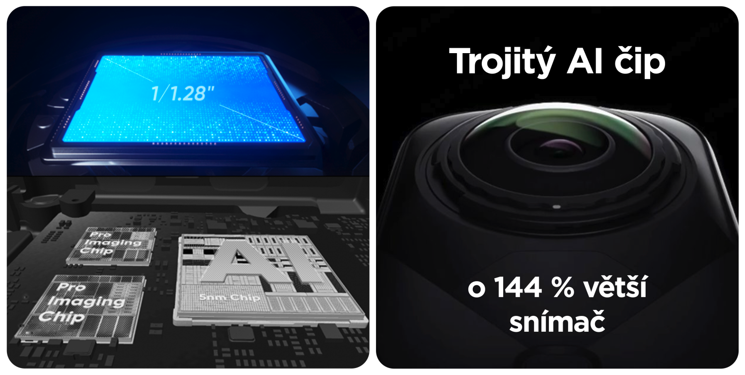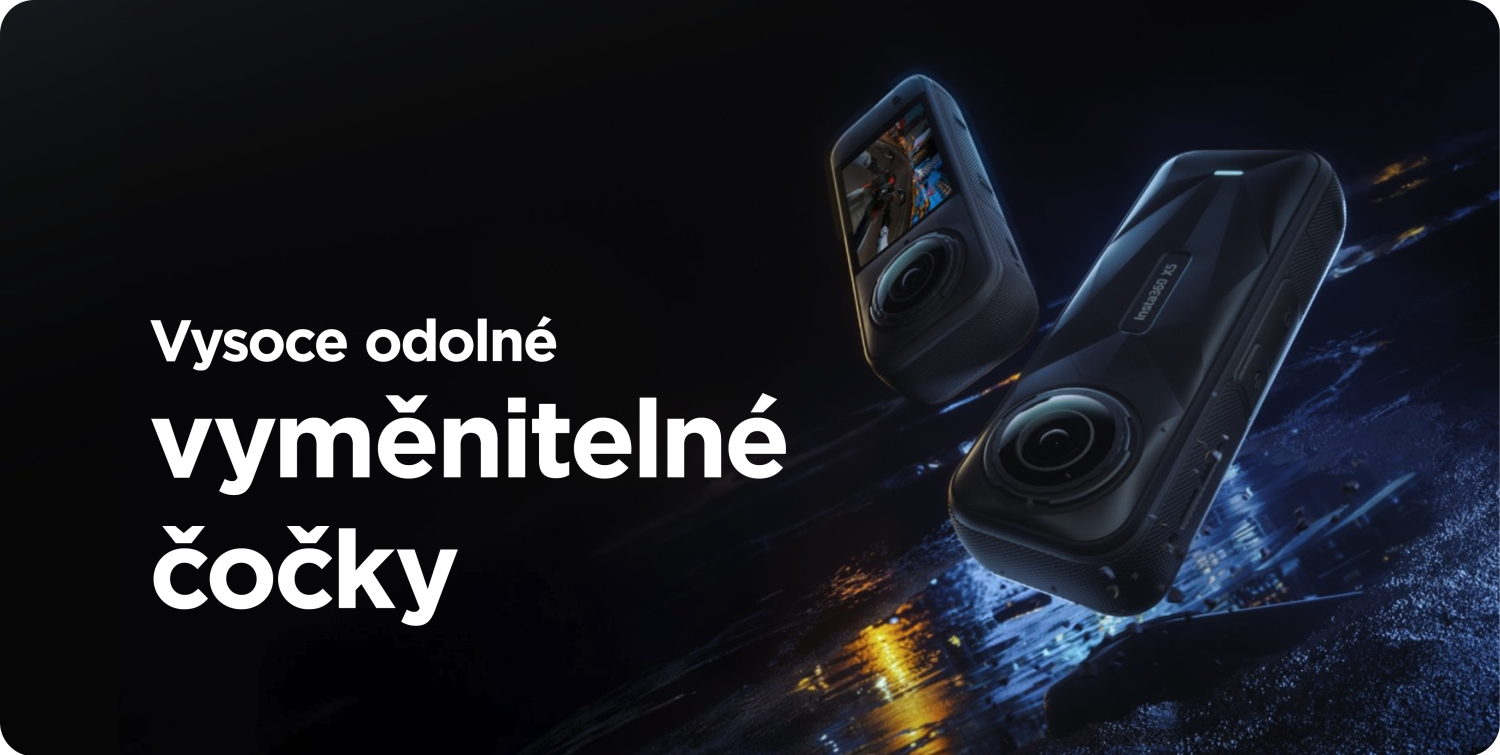 Akční 360° kamera Insta360 X5 se snímačem 1/1.28" a triple AI čipem. Rozlišení 360° videa až 8K/30fps, při 4K až 120 fps. Foto rozlišení 72 Mpx. Vodotěsnost do 15 m, 6osá stabilizace FlowState, bitrate 180 Mbps, vylepšený noční režim. Baterie 2400 mAh s výdrží až 185 min. Nabízí InstaFrame mód pro okamžité sdílení, vylepšený zvuk s novou vestavěnou ochranou proti větru. Má odolné a vyměnitelné čočky. Rozměr kamery 46 x 124,5 x 38,2 mm. Součástí balení je action invisible selfie stick, 128 GB microsd paměťová karta, FlexiCare na 2 roky, přenosné pouzdro, USB C/C kabel, hadřík na čištění čoček, nálepky na čištění.