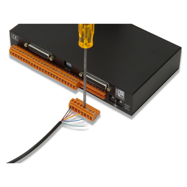 Všechna připojení se provádějí na zadním panelu pomocí šroubových svorek. Až 3 zařízení eBOX io lze zapojit do kaskády a převést tak všech 24 vstupů a výstupů GPI eBOX. LED diody na předním panelu indikují stav signálu pro snadné řešení problémů. Zařízení eBOX io se vejde vedle zařízení eBOX do jednoho stojanu.