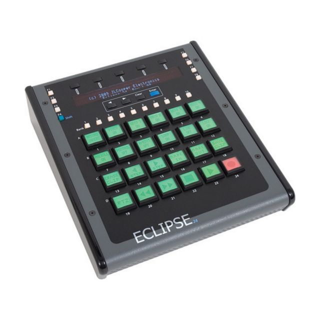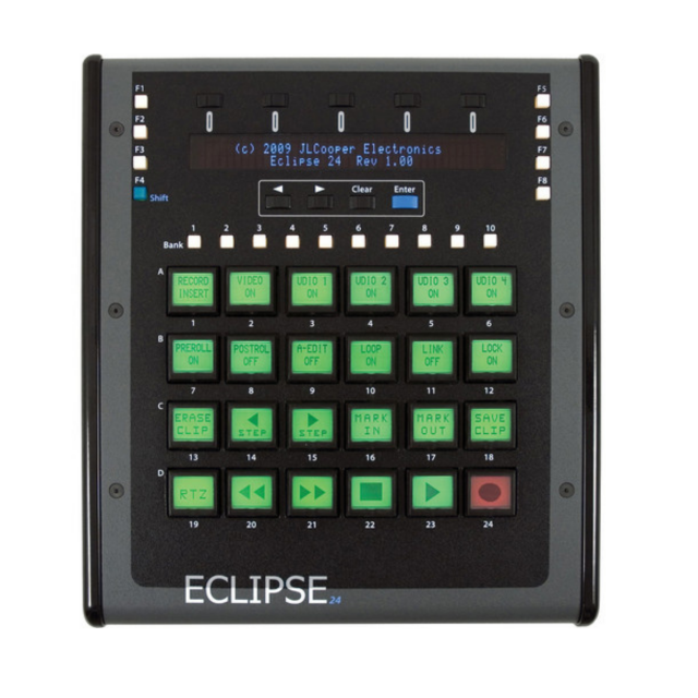 JLCooper Eclipse 24 Midnight Tactile Command Palette je vybaven 24 dálkově ovládanými 64x32 LCD klávesami (hi-res, RGB), které mohou zobrazovat až 40 znaků textu a grafiky pomocí integrovaných příkazových sériových rozhraní. Středně velký stolní ovladač je také vybaven 17 dalšími funkčními a navigačními přepínači a 10 tlačítky bank.