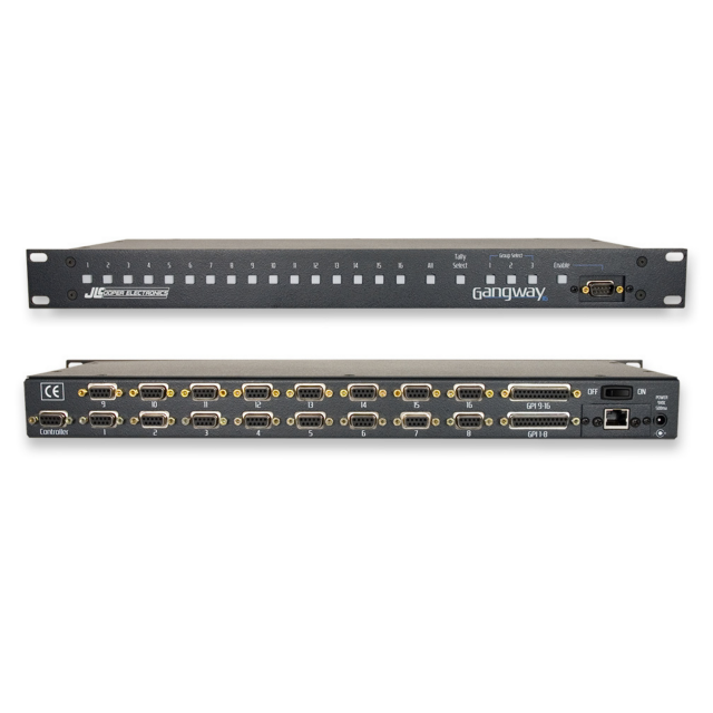 GangWay16 od společnosti JL Cooper je kompaktní, snadno použitelný jednoportový přepínač RS-422 a Trigger Box GPI. Umožňuje ovládat až 16 stupňů nebo videoserverů z jediného 9kolíkového ovladače. Přední panel obsahuje podsvícené tlačítko pro jasnou indikaci stavu každého stroje, tlačítko pro rychlé zapnutí všech strojů, 3 skupiny uživatelských předvoleb a tlačítko pro výběr tally.