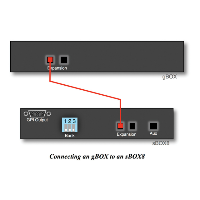 Stojanová verze dálkového spouštěče pro gBox a eBox připojuje sBOX ke gBOX (GPO Trigger Box) nebo eBOX (Quad Serial/Ethernet/GPI Interface) jako jednoduchý dálkový ovladač pro spouštění událostí GPO. Kromě toho můžete pomocí eBOXu spustit odesílání uživatelsky naprogramovaných sériových nebo ethernetových zpráv. Tento dálkový spouštěč je vybaven 8 tlačítky s podsvícením LED a podsvíceným přepínačem bank, který umožňuje jedním dálkovým spouštěčem ovládat až 24 GPO. Více jednotek dálkového spouštění (až 3) může poskytnout vyhrazená tlačítka až pro 24 GPO. Tuto kompaktní jednotku lze umístit za klávesnici počítače.