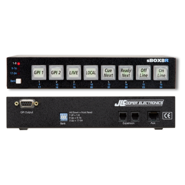 Stojanová verze dálkového spouštěče pro gBox a eBox připojuje sBOX ke gBOX (GPO Trigger Box) nebo eBOX (Quad Serial/Ethernet/GPI Interface) jako jednoduchý dálkový ovladač pro spouštění událostí GPO. Kromě toho můžete pomocí eBOXu spustit odesílání uživatelsky naprogramovaných sériových nebo ethernetových zpráv. Tento dálkový spouštěč je vybaven 8 tlačítky s podsvícením LED a podsvíceným přepínačem bank, který umožňuje jedním dálkovým spouštěčem ovládat až 24 GPO. Více jednotek dálkového spouštění (až 3) může poskytnout vyhrazená tlačítka až pro 24 GPO. Tuto kompaktní jednotku lze umístit za klávesnici počítače.