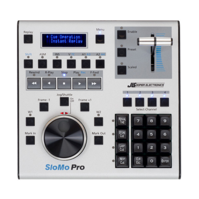 SloMoPro™ USB je vybaven profesionálními transportními tlačítky, vlastním, opticky kódovaným kolečkem JLC jog wheel s kroužkem shuttle, vysoce kvalitním T-Bar pro slo-mo, snadno čitelným 2 x 16 VF displejem, numerickou klávesnicí plné velikosti a funkčními tlačítky s rychlým přístupem.