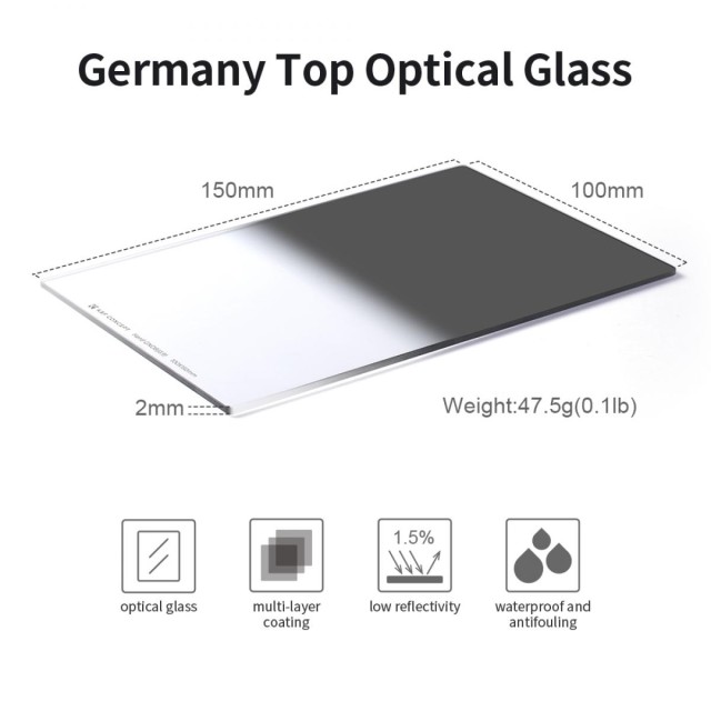 Čtvercový filtr K&F Concept 100×150×2 mm s tvrdým přechodem GND8 je určen pro venkovní scény s vysokým kontrastem, jako jsou západy slunce, východy slunce nebo horské krajiny, kde se střídají světlé a tmavé oblasti. Je vyroben z prvotřídního japonského optického skla s přesným oboustranným leštěním a nanovrstvou, která zajišťuje ostrý obraz ve vysokém rozlišení s vynikající věrností barev. Díky antireflexní vrstvě a snadno čistitelnému povrchu je odolným a profesionálním řešením pro kontrolu expozice v náročných světelných podmínkách.